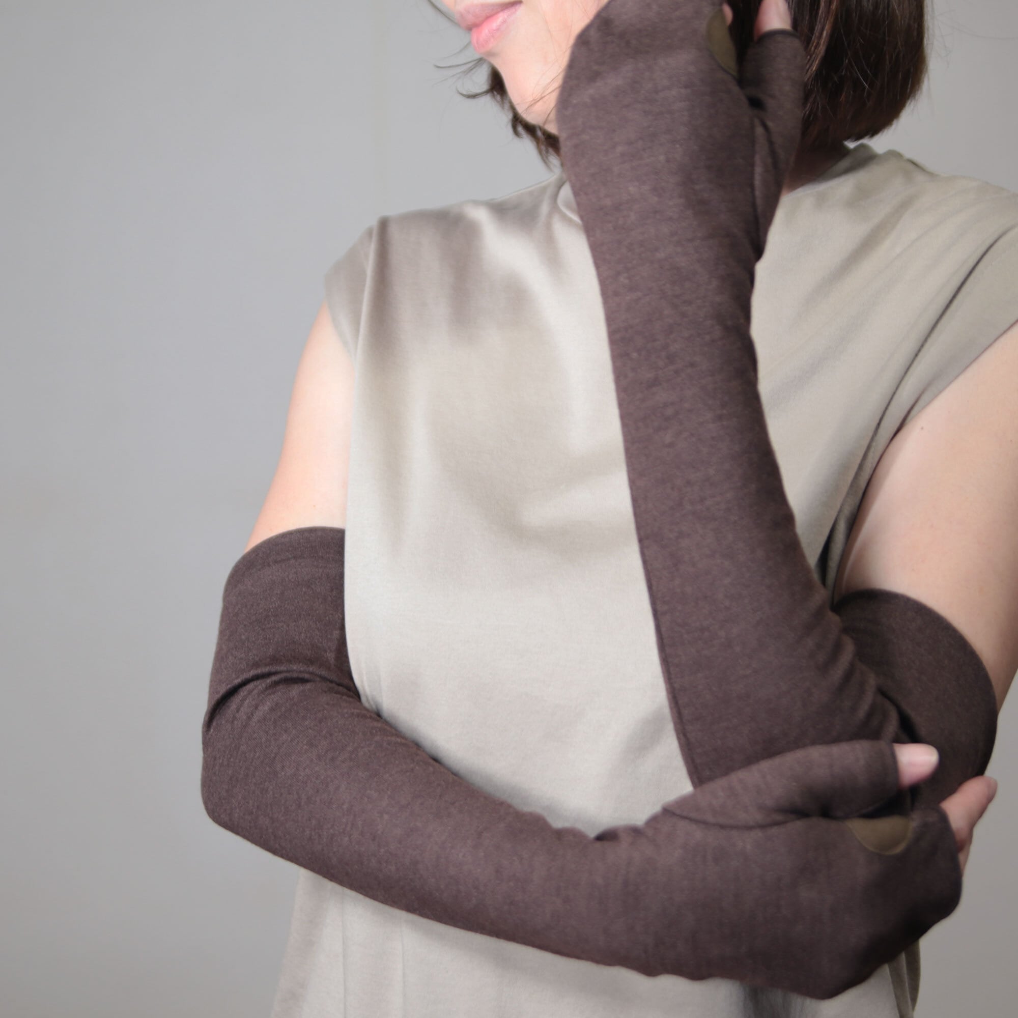 【シルクウール・アームカバー・ミテーヌセミロング】 ブラウン/上質で高級感のある天然繊維・シルクウールを使用したUVケア・アームカバー
