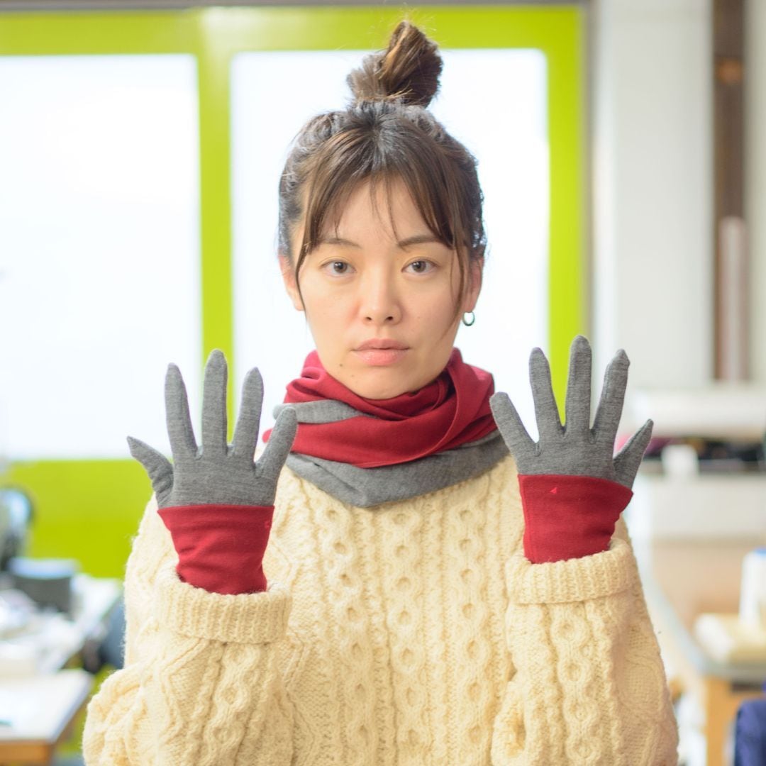 取引先に「マフラーの合わせ縫いどこにお願いしても断られました。江本さんで出来ませんか?」と言われ驚きました。なぜなら、手袋職人からすればいつももっと細かい作業をしているので当たり前に出来ることだからです。しかし、実は一般的なアパレルでは出来ない技術だったんです。さらに、意外と知られてないですが手袋用ミシンは他とは違います。手袋専用ミシンでは手の動きに合わせて伸縮性を持たせる縫い目になっています。この技術があるから長いマフラーを縫い合わせてもしわが出来ずきれいな見た目に仕上げることが出来るんです。その結果出来たのが、「手袋職人だから出来たコンビマフラー」です。