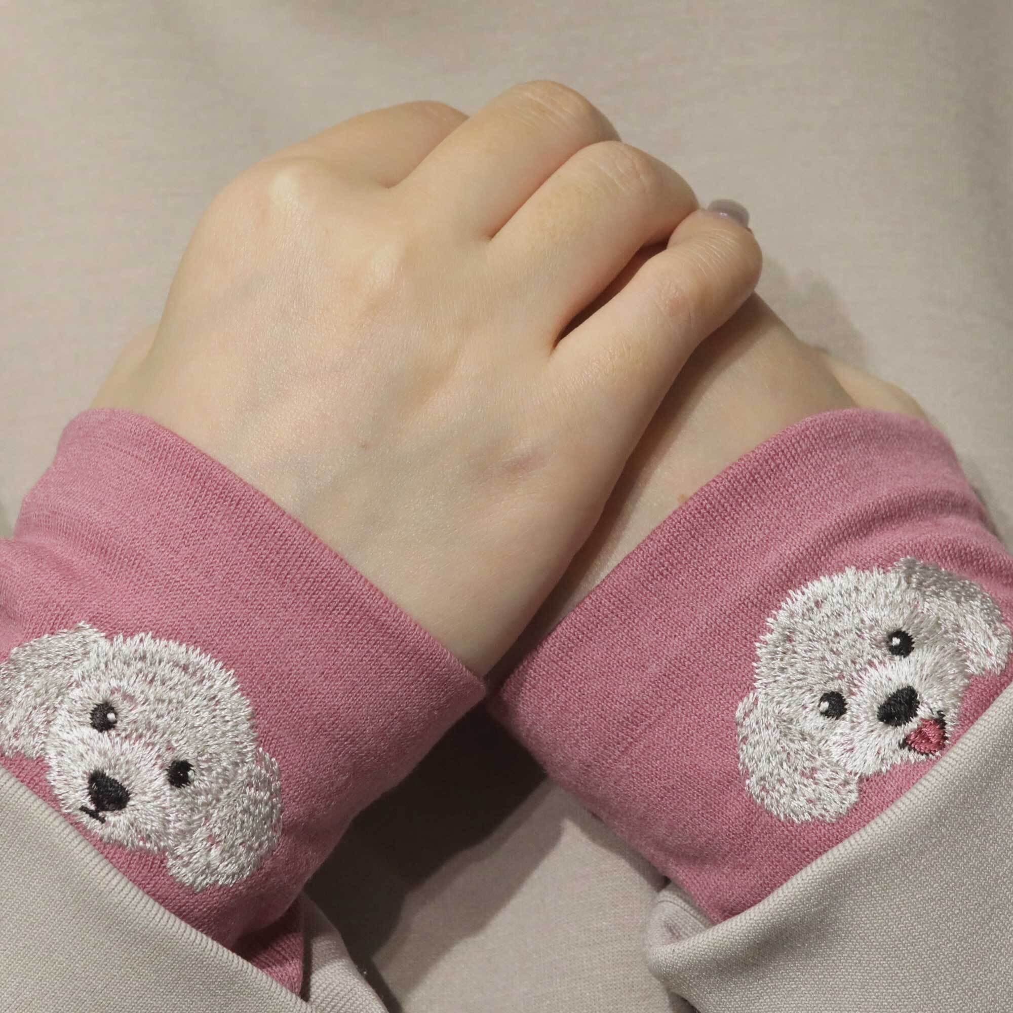 袖口から覗く愛らしい犬刺しゅうをあしらいました